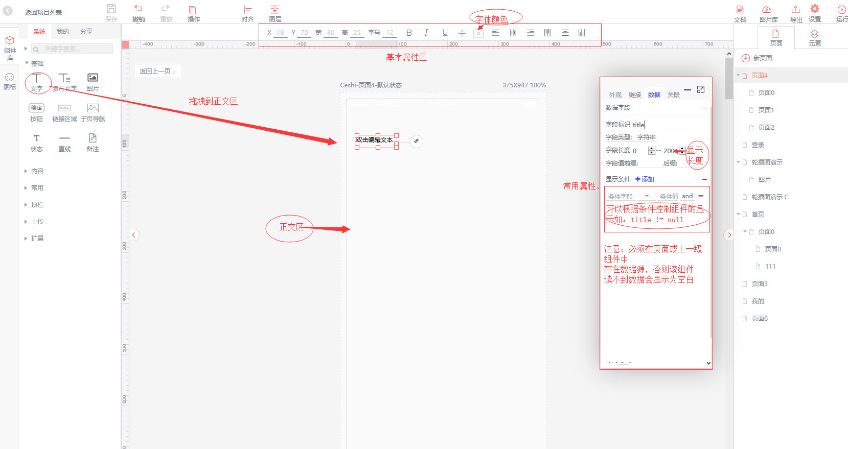 a、字段标识一般指后端数据源中对于传输的字段。有多种数据源格式如page.title意义为页面数据源中的title字段的内容,无前缀的字段如title一般为当前自定义组件数据源内子组件的字段绑定。更多数据源格式参考API使用及数据绑定。